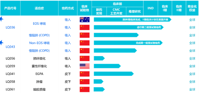 BG大游集团生物的研发管线中,还包括治疗肺纤维化的LQ056和治疗囊性纤维化的LQ059,同样采用吸入给药。